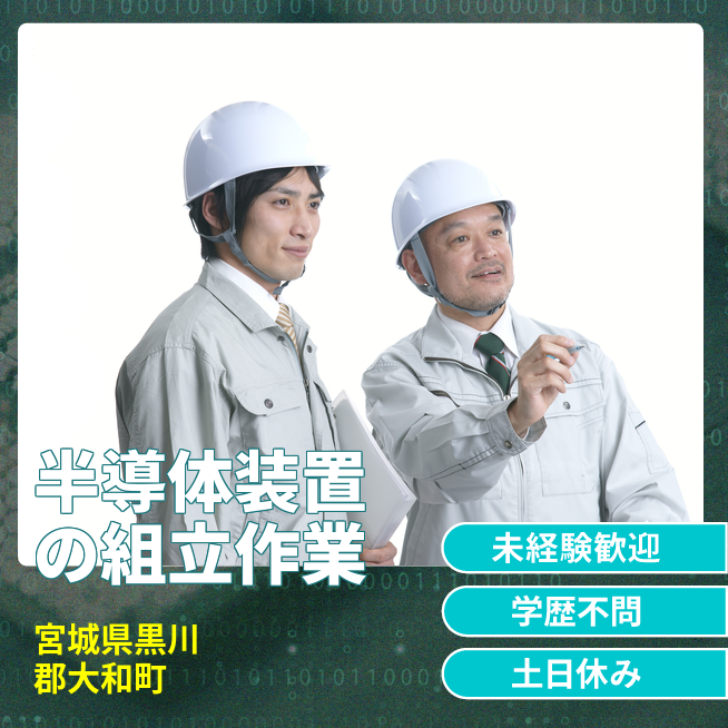 給与詳細 月収例 240,675円 時給例 1,218円 勤務地 宮城県黒川郡大和町 仕事内容 トルクレンチやドライバーといった工具を使用して半導体製造装置の部品を手順書を見ながら組み立てる作業になります。