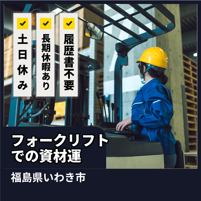 給与詳細 月収例 237,000円 時給例 1,200円 勤務地 福島県いわき市 仕事内容 ■カウンターフォークでの資材運搬(7~8割)