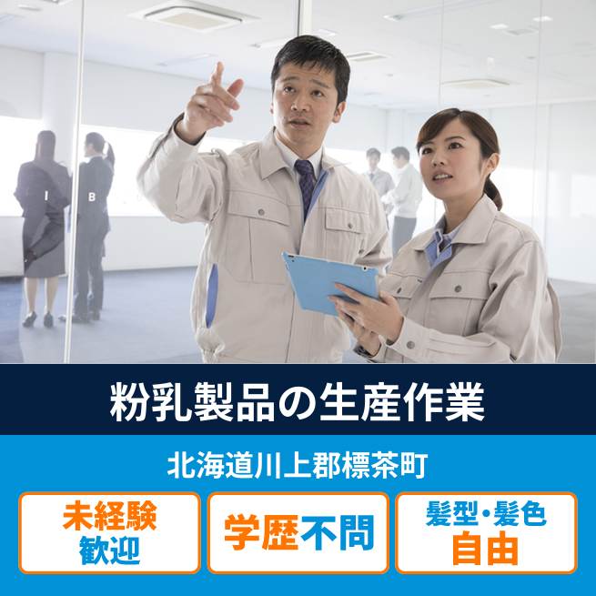 給与詳細 月収例 221,890円 日給例 10,750円 勤務地 北海道川上郡標茶町 仕事内容 【25㎏入り粉乳製品生産】に係る業務