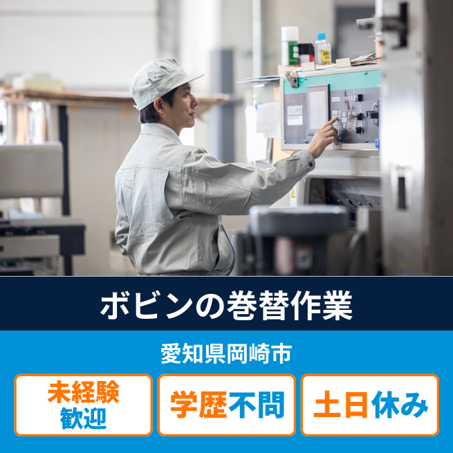 給与詳細 月収例 240,500円 日給例 10,400円 勤務地 愛知県岡崎市 仕事内容 巻き替え業務という糸が巻かれているボビンと、糸が巻かれていない空のボビンを機械にセットし、ボタンを押すことで自動的に巻き替えを行う作業です。