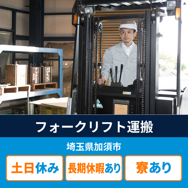 給与詳細 月収例 257,010円 日給例 12,000円 勤務地 埼玉県加須市 仕事内容 ・フォークリフト運転業務