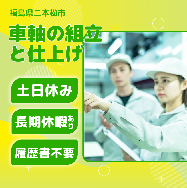 給与詳細 月収例 221,576円 時給例 1,143円 勤務地 福島県二本松市 仕事内容 フォークリフト車軸の組立、仕上げ作業です。