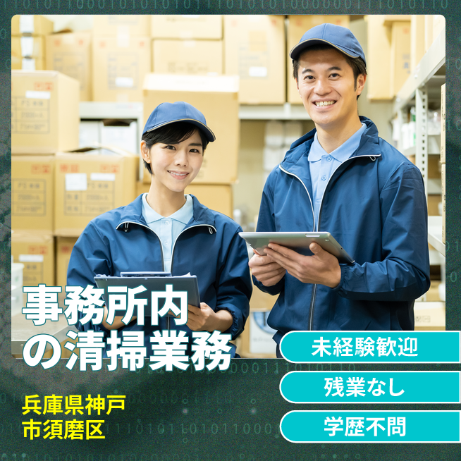 給与詳細 月収例 100,000円 日給例 10,000円 勤務地 兵庫県神戸市須磨区 仕事内容 事務所内の清掃業務に携わっていただきます。