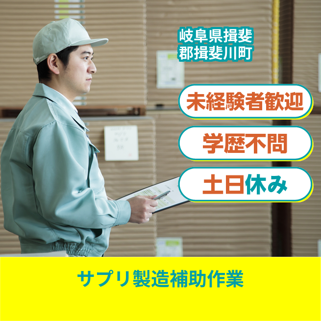 給与詳細 月収例 224,250円 日給例 10,400円 勤務地 岐阜県揖斐郡揖斐川町 仕事内容 サプリメントの試作品の製造の補助作業をお願い致します。