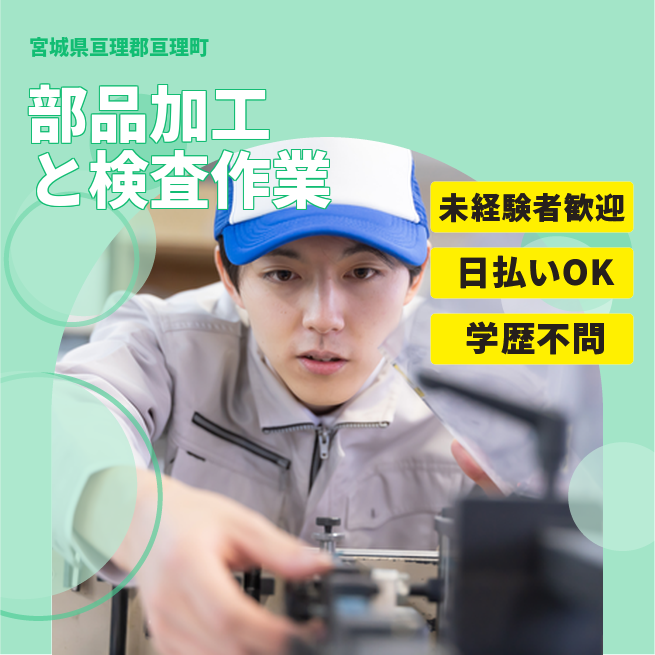給与詳細 月収例 229,017円 日給例 10,400円 勤務地 宮城県亘理郡亘理町 仕事内容 【部品の加工・検査】