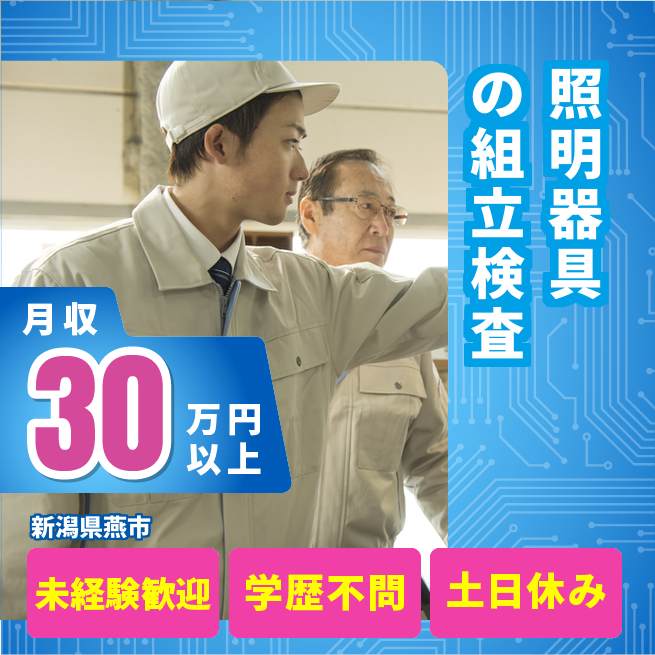 給与詳細 月収例 303,000円 時給例 1,180円 勤務地 新潟県燕市 仕事内容 【照明器具の組立・検査など(夜勤)】
