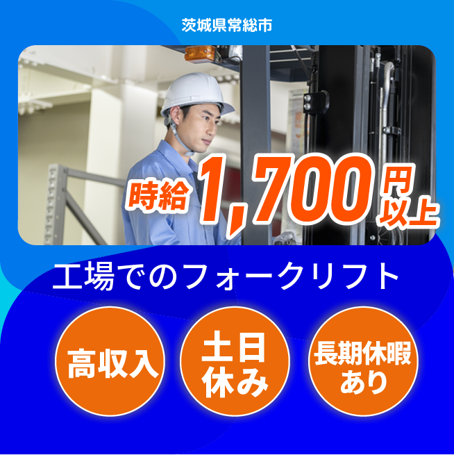 給与詳細 月収例 276,000円 時給例 1,730円 勤務地 茨城県常総市 仕事内容 【フォークリフト/要資格(日勤)】