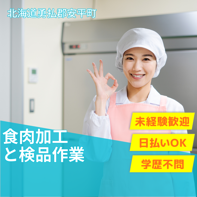 給与詳細 月収例 218,000円 日給例 10,080円 勤務地 北海道勇払郡安平町 仕事内容 【食肉加工・検品作業(日勤)】