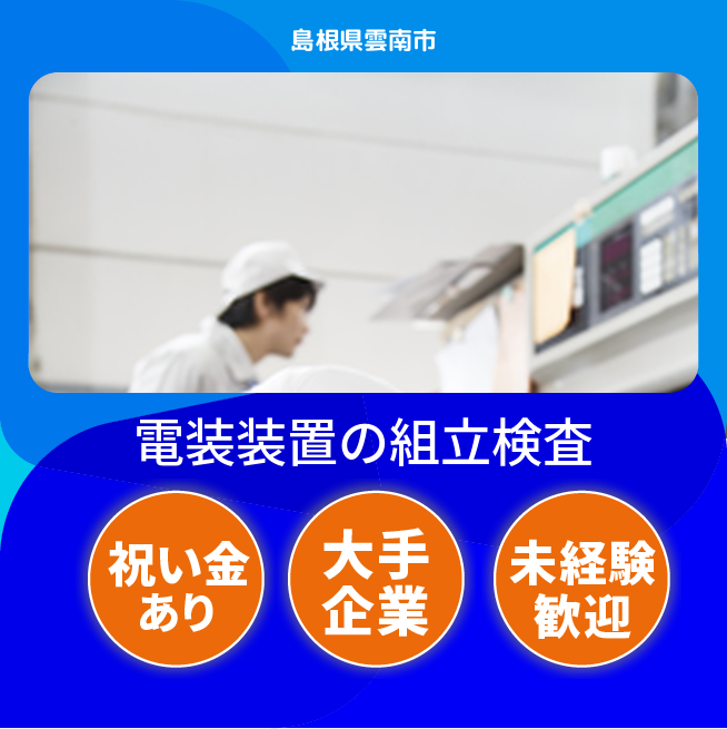 給与詳細 月収例 225,000円 日給例 10,560円 勤務地 島根県雲南市 仕事内容 【組立・測定チェックなど(日勤)】