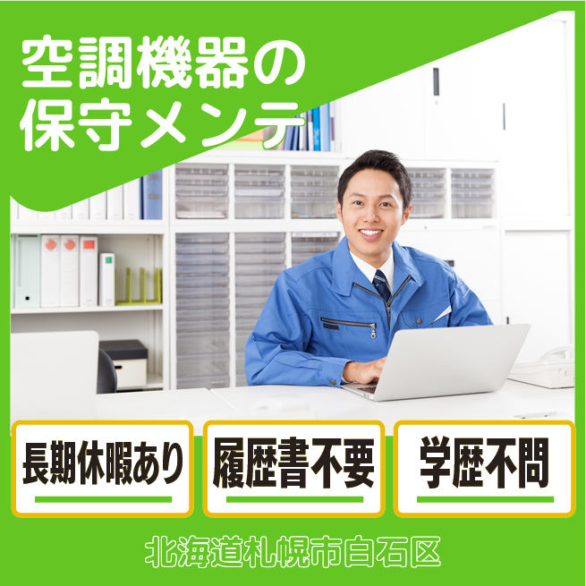 給与詳細 月収例 221,000円 日給例 10,480円 勤務地 北海道札幌市白石区 仕事内容 【空調機器の保守メンテナンス(日勤)】