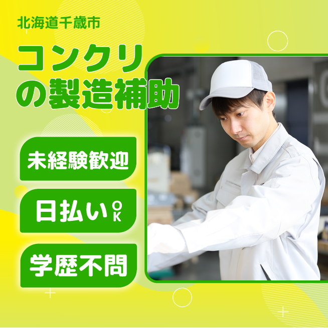 給与詳細 月収例 229,000円 日給例 10,960円 勤務地 北海道千歳市 仕事内容 【コンクリート製造補助(日勤)】