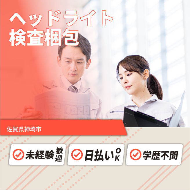 給与詳細 月収例 193,000円 時給例 1,100円 勤務地 佐賀県神埼市 仕事内容 【検査・梱包(夜勤)】