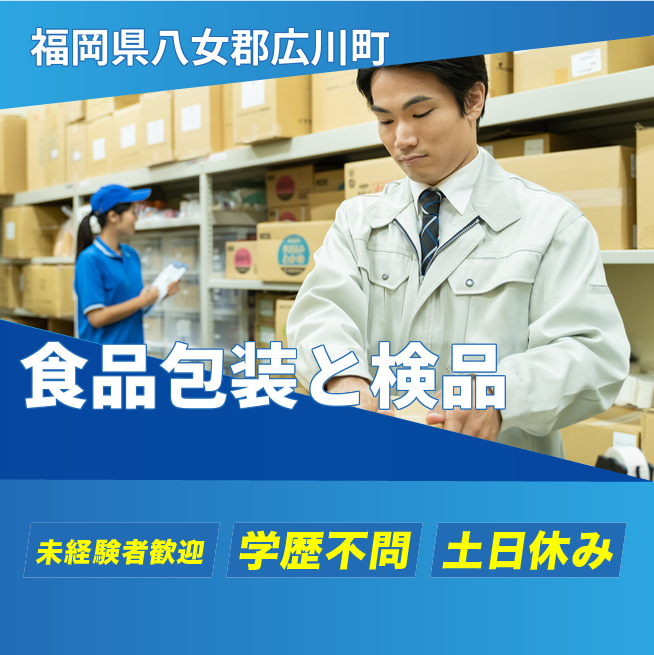 給与詳細 月収例 192,000円 時給例 1,200円 勤務地 福岡県八女郡広川町 仕事内容 【業務内容】調味料や加工食品の包装と検品作業