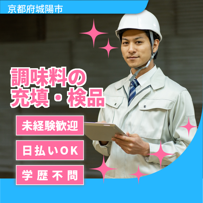 給与詳細 月収例 199,000円 時給例 1,200円 勤務地 京都府城陽市 仕事内容 【粉体調味料の充填や検品など(日勤)】