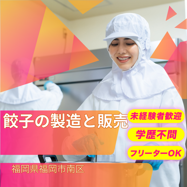 給与詳細 月収例 192,000円 時給例 1,200円 勤務地 福岡県福岡市南区 仕事内容 【餃子の製造・販売(日勤)】