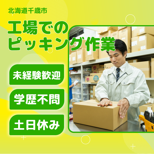 給与詳細 月収例 193,000円 時給例 1,200円 勤務地 北海道千歳市 仕事内容 【軽作業・ピッキング(日勤)】