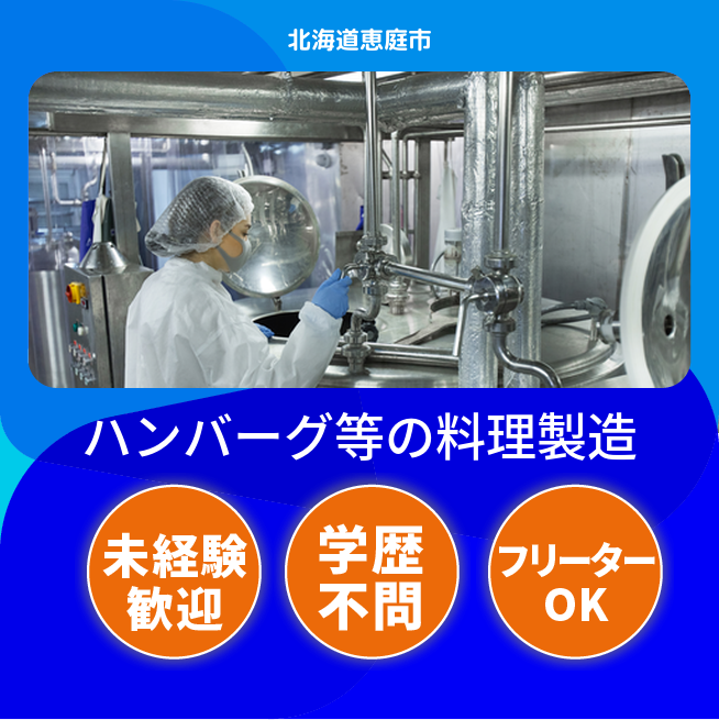 給与詳細 月収例 76,000円 時給例 1,200円 勤務地 北海道恵庭市 仕事内容 【ファミレスのハンバーグ製造(日勤)】