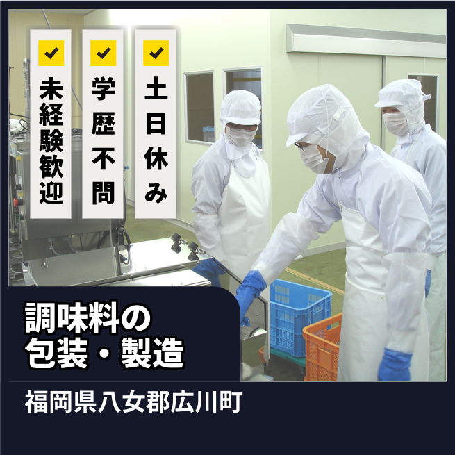 給与詳細 月収例 192,000円 時給例 1,200円 勤務地 福岡県八女郡広川町 仕事内容 【調味料や加工食品の包装・製造(日勤)】