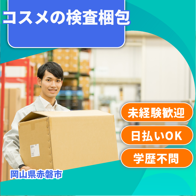 給与詳細 月収例 192,000円 時給例 1,200円 勤務地 岡山県赤磐市 仕事内容 【コスメ製品の検査・梱包(日勤)】