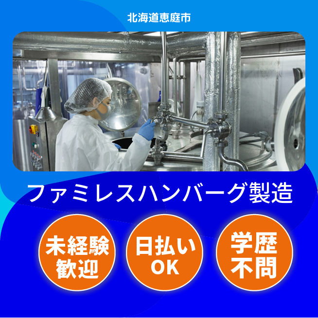 給与詳細 月収例 209,000円 時給例 1,200円 勤務地 北海道恵庭市 仕事内容 【ファミレスのハンバーグ製造(日勤)】
