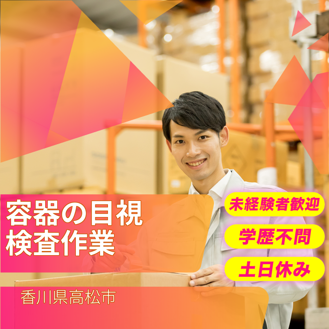 給与詳細 月収例 197,000円 時給例 1,200円 勤務地 香川県高松市 仕事内容 【プラスチック容器の目視検査(2交替)】