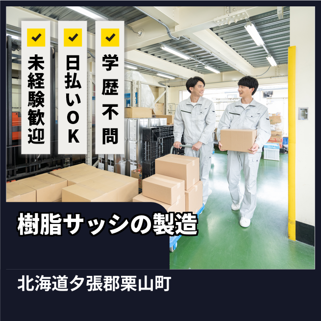 給与詳細 月収例 206,000円 時給例 1,230円 勤務地 北海道夕張郡栗山町 仕事内容 【樹脂サッシ製造(日勤)】