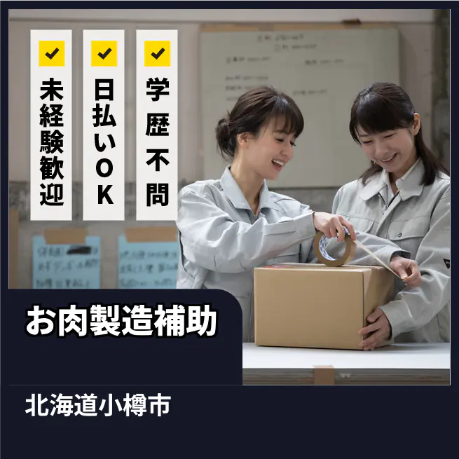 給与詳細 月収例 222,000円 時給例 1,230円 勤務地 北海道小樽市 仕事内容 【業務内容】 お肉の製造補助および包装作業を担当します。