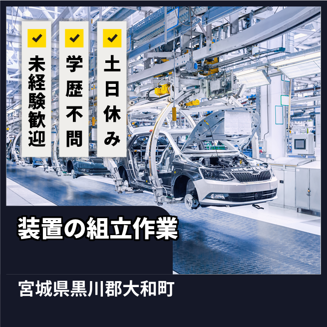 給与詳細 月収例 268,000円 日給例 10,000円 勤務地 宮城県黒川郡大和町 仕事内容 【装置の組立作業(日勤)】