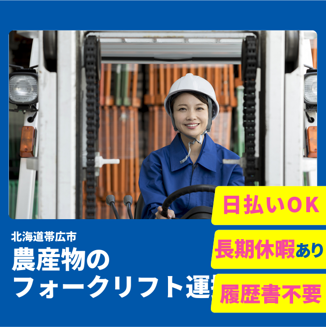 給与詳細 月収例 226,000円 日給例 10,000円 勤務地 北海道帯広市 仕事内容 【フォークリフト運搬/要資格(日勤)】