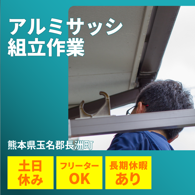給与詳細 月収例 234,000円 日給例 10,000円 勤務地 熊本県玉名郡長洲町 仕事内容 【アルミサッシの組立(日勤)】