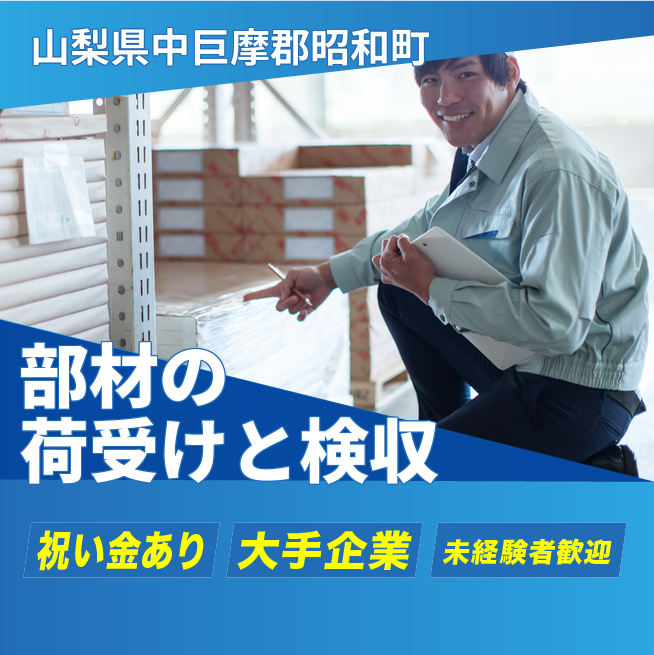 給与詳細 月収例 193,000円 日給例 10,000円 勤務地 山梨県中巨摩郡昭和町 仕事内容 【軽作業/部材の荷受け、検収など(日勤)】