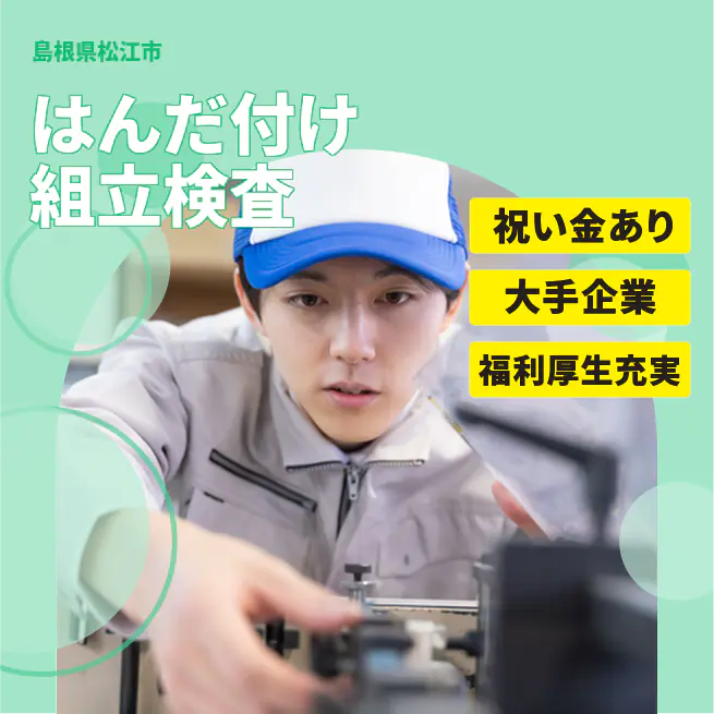 【月収例】20.0万円(20日勤務 ※残業なしの場合) 【入社祝い金】 入社祝金:総額10万円支給! 交通費 支給なし 応募の流れ 本ページ内<応募する>ボタンより、必要項目をご入力の上、ご応募ください。 勤務地 【勤務地】島根県松江市宍道町宍道 勤務時間 【勤務地】【日勤】