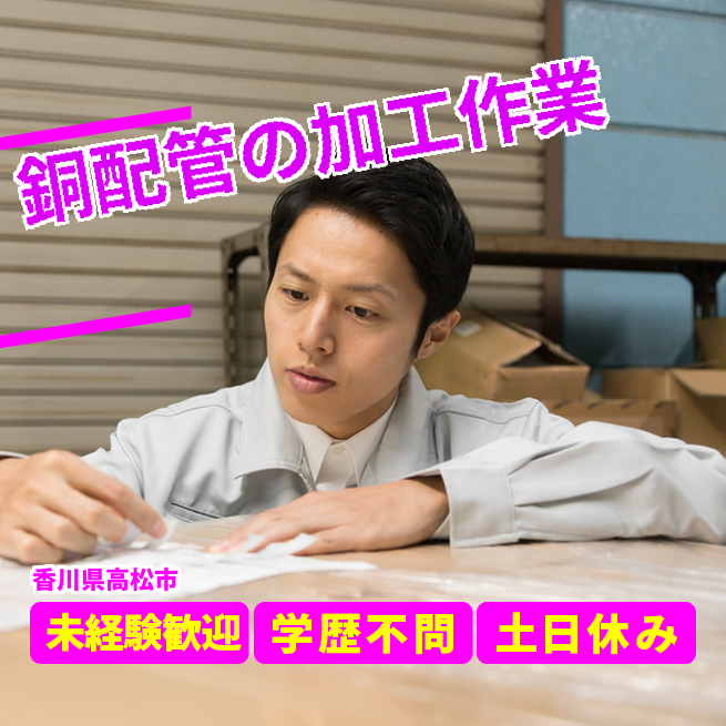 給与詳細 月収例 220,000円 日給例 10,000円 勤務地 香川県高松市 仕事内容 【銅配管の加工作業(日勤)】