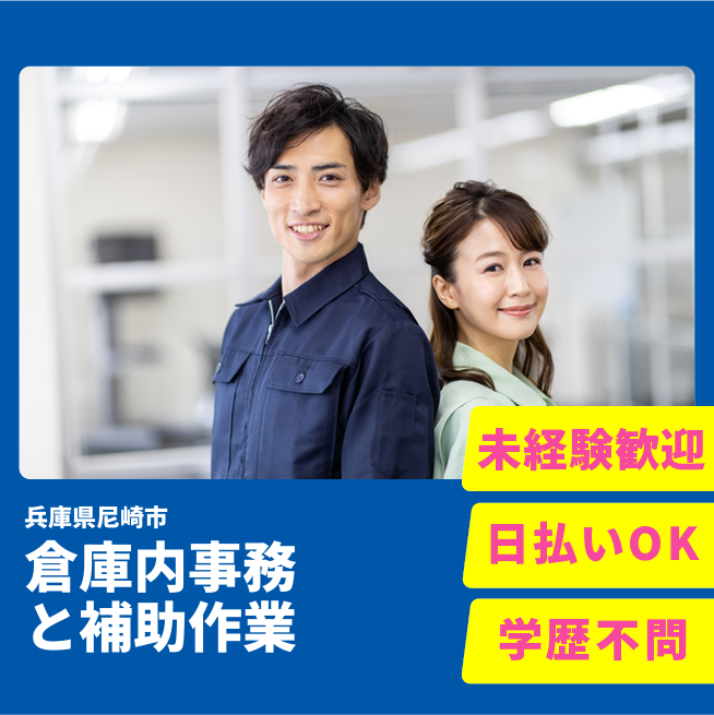 給与詳細 月収例 200,000円 日給例 10,000円 勤務地 兵庫県尼崎市 仕事内容 【倉庫内での事務や補助作業(日勤)】