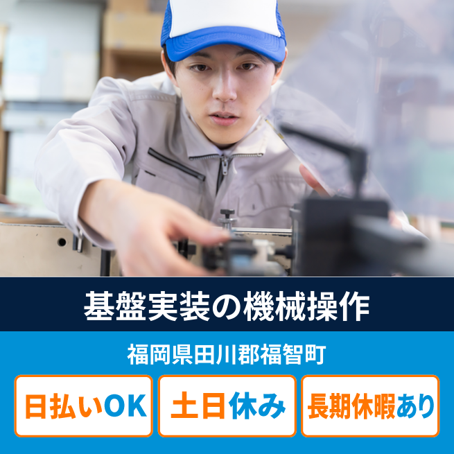 給与詳細 月収例 215,000円 日給例 10,000円 勤務地 福岡県田川郡福智町 仕事内容 【基盤実装の機械オペレーター(日勤)】