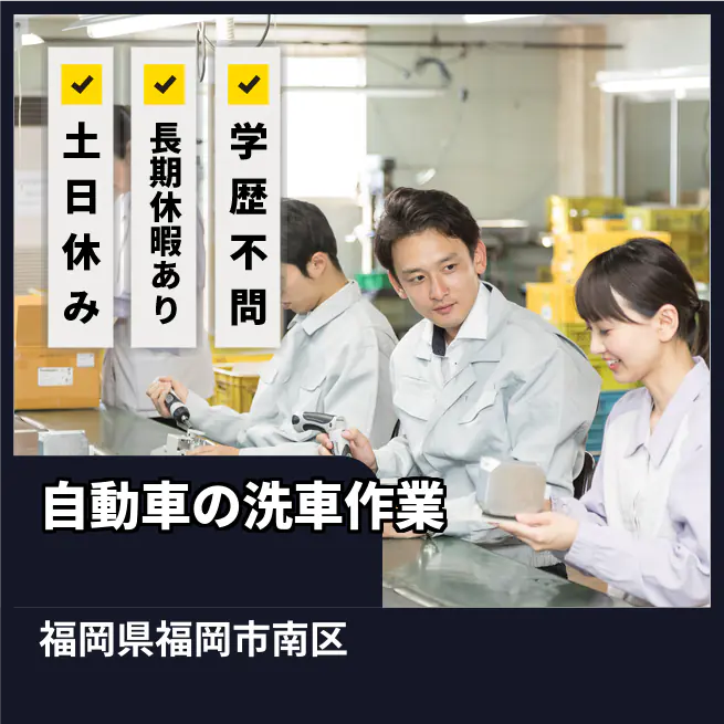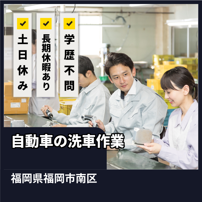 給与詳細 月収例 195,000円 日給例 10,000円 勤務地 福岡県福岡市南区 仕事内容 【自動車の洗車(日勤)】
