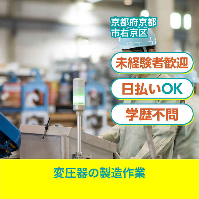 給与詳細 月収例 240,000円 日給例 10,400円 勤務地 京都府京都市右京区 仕事内容 【各種変圧器の製造(日勤)】