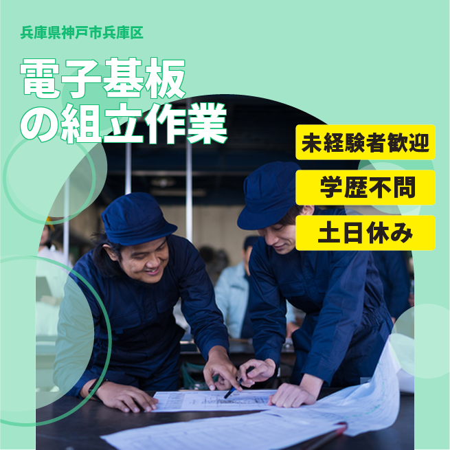 給与詳細 月収例 232,000円 日給例 10,400円 勤務地 兵庫県神戸市兵庫区 仕事内容 【電子基板の組立(日勤)】