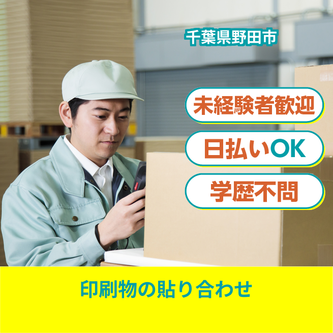 給与詳細 月収例 253,000円 日給例 10,400円 勤務地 千葉県野田市 仕事内容 【印刷物の貼り合わせ、検品(日勤)】
