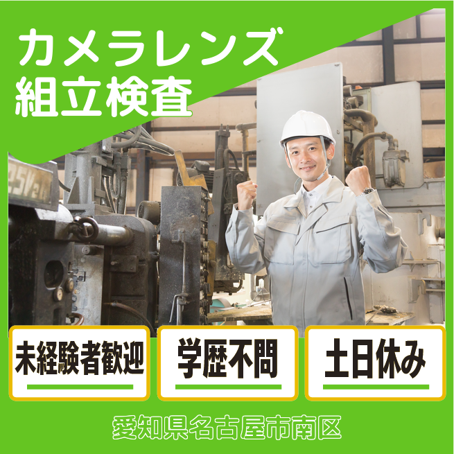 給与詳細 月収例 225,000円 日給例 10,400円 勤務地 愛知県名古屋市南区 仕事内容 【産業用カメラレンズの組立(日勤)】