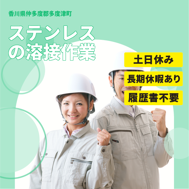 給与詳細 月収例 250,000円 日給例 10,400円 勤務地 香川県仲多度郡多度津町 仕事内容 【ステンレスの溶接・製缶/要資格(日勤)】