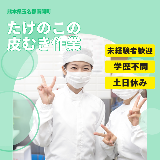 給与詳細 月収例 251,000円 日給例 10,400円 勤務地 熊本県玉名郡南関町 仕事内容 【たけのこの皮むき作業(日勤)】