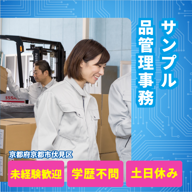 給与詳細 月収例 232,000円 日給例 10,400円 勤務地 京都府京都市伏見区 仕事内容 【サンプリング品の管理/事務(日勤)】
