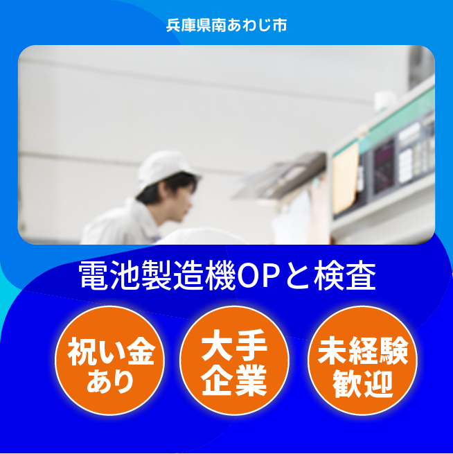 給与詳細 月収例 291,000円 日給例 10,400円 勤務地 兵庫県南あわじ市 仕事内容 【電池製造機のオペレーター・検査/2交替】