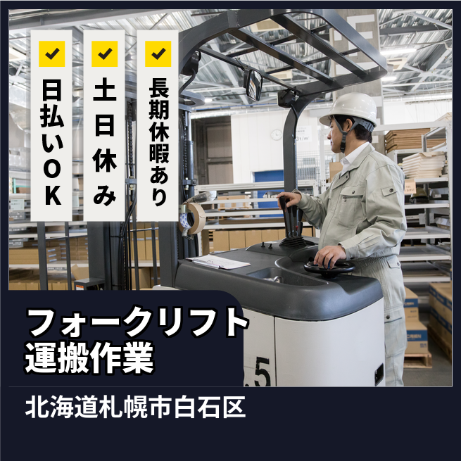 給与詳細 月収例 208,000円 日給例 10,400円 勤務地 北海道札幌市白石区 仕事内容 【フォークリフトでの運搬/要資格(日勤)】