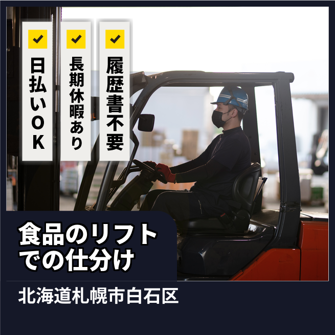 給与詳細 月収例 267,000円 日給例 10,400円 勤務地 北海道札幌市白石区 仕事内容 【要資格/フォークリフト・仕分(日勤)】