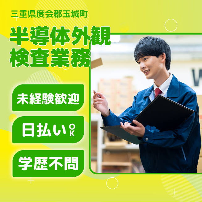給与詳細 月収例 217,000円 日給例 10,400円 勤務地 三重県度会郡玉城町 仕事内容 【外観検査スタッフ(日勤)】
