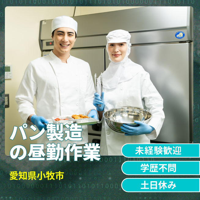給与詳細 月収例 208,000円 日給例 10,400円 勤務地 愛知県小牧市 仕事内容 【パンの製造(昼勤)】