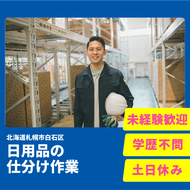 給与詳細 月収例 208,000円 日給例 10,400円 勤務地 北海道札幌市白石区 仕事内容 【ピッキングや簡単な軽作業(日勤)】