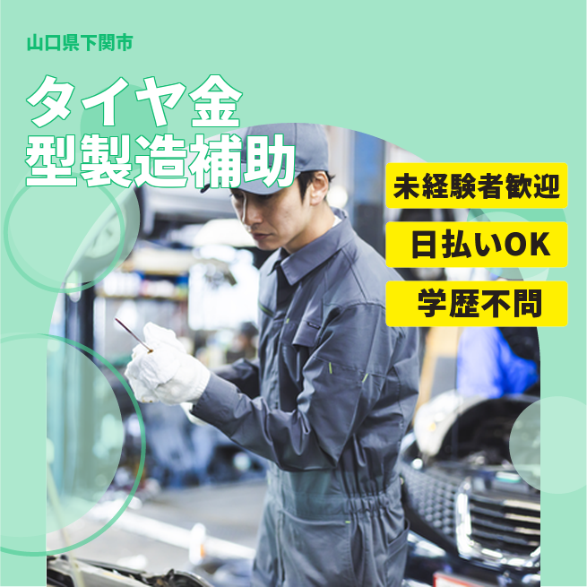 給与詳細 月収例 249,000円 日給例 10,800円 勤務地 山口県下関市 仕事内容 【タイヤ金型の製造サポート(日勤)】